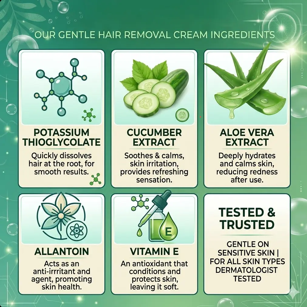A: Unlike razors that cut hair bluntly at the surface, our cream gently dissolves hair at the root. This means no razor burn, no strawberry legs, and no prickly stubble. Plus, it is packed with soothing ingredients like Aloe Vera and Cucumber Extract to hydrate your skin while it works.